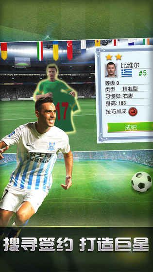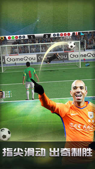当球员达到一定水平,玩家就能带队参赛。主罚点球时,手指划屏确定球的踢出方向,结合球员实力属性决定球速和方向;扑点球时,横向划屏操作守门员扑救方向,两者共同决定点球是否罚进。