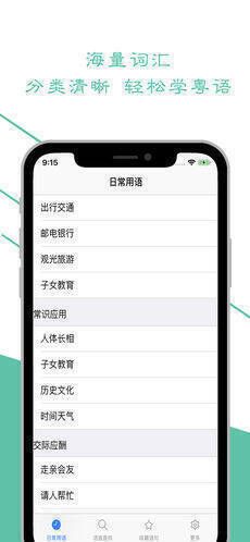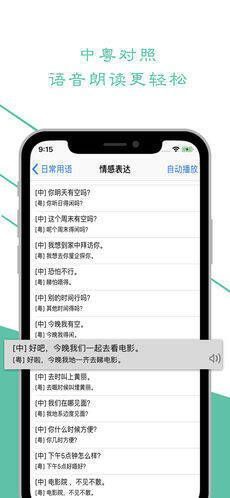 它采用真人发音,有中文粤语对照,包含日常用语、交际用语、常识应用等内容,还带有搜索功能。有了汉语对照和粤语发音,学粤语不再困难。你可以左滑标记语句进行收藏,还能自动连续播放,畅快学习。