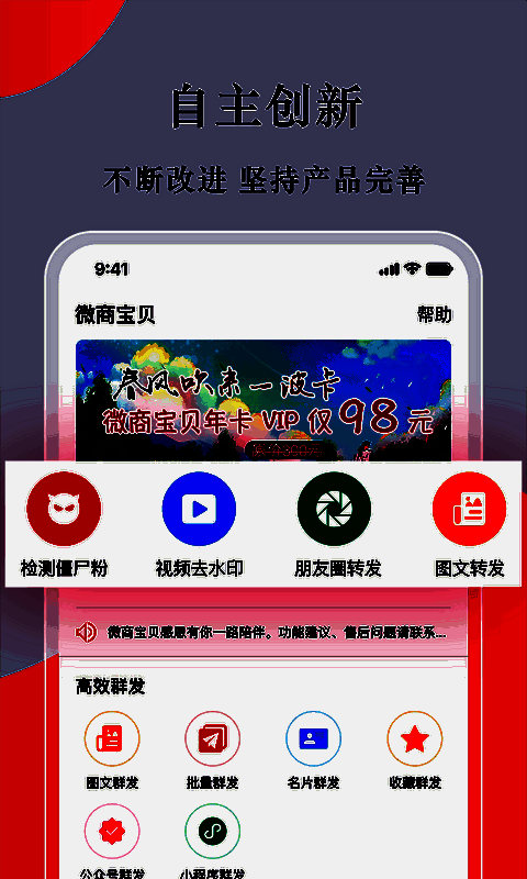 微商宝贝app是微商必备工作工具,能助力微商将商品推广给更多潜在客户,增加产品曝光,提高销售额。它基于安卓系统,依托微信,为用户提供便捷、快速的微信使用体验。还能帮助有阅读、触屏、声音控制困难的用户解决生活难题。其包含检测僵尸粉、视频去水印、转发等功能,操作简单,支持分享。