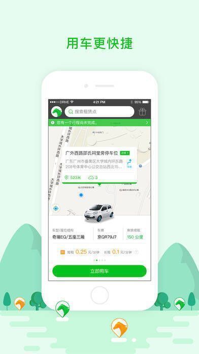 《驾呗租车》苹果版是一款极为实用的电动汽车共享软件。它支持一键取车,操作简单便捷,用户随时随地都能租车,畅享自由出行。其价格合理,采用绿色无污染的电动汽车,让出行更健康。还车也十分方便。