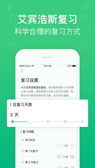 它会替你牢记复习这件事。单词学完后,会依据艾宾浩斯遗忘曲线自动推送复习提醒,还有复习日历帮你落实进度,从此再也不用担心忘记按时复习,单词学习更有成效。