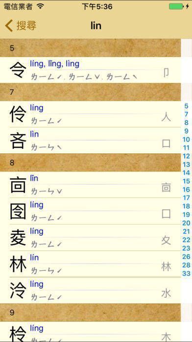 1、搜寻方式多样,支持「汉字、汉语拼音、注音符号、分解查字、笔顺」等,在同一搜寻栏输入关键字,搜寻出的汉字按笔划分类。