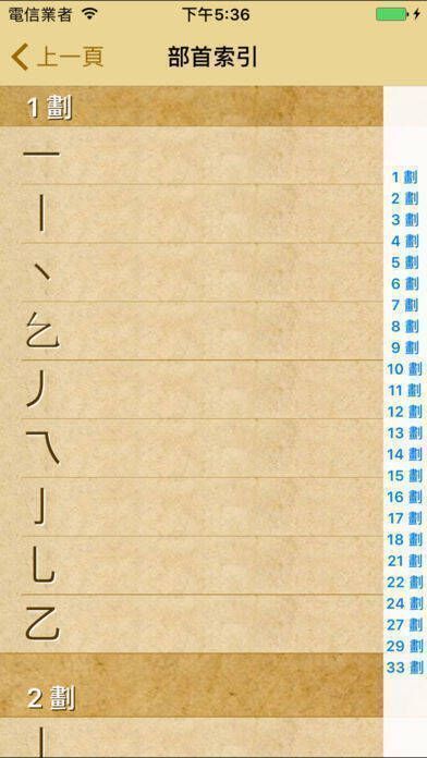 3、部首索引按笔划分类,可搜寻某部首下的所有汉字(同样按笔划分类)。