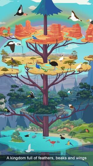 1、升级大树,解锁美丽栖息地,打造属于自己的世界!解锁成就,推动成长,用各种迷人的鸟类构建完美的鸟类天堂。