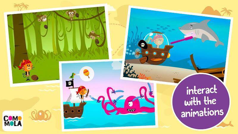 《Comomola海盗》专为孩子设计,无广告、无付费墙,操作简单,孩子一根手指就能挖掘游戏秘密。这是孩子和家长都会喜爱的体验。玩家拿上海盗装备,在加勒比海航行、探索海底、丛林徒步找宝藏。旅途中会遇到鲸、海豚等动物,还有海盗、海难幸存者等有趣角色。