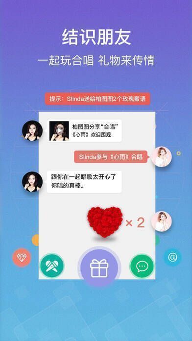 人气歌手明星、网络红人纷纷入驻,让您能与他们进行零距离对话;支持好友合唱、歌曲交流、聊天互动,帮您结识更多志同道合的朋友,因歌结缘变得轻而易举;一键即可分享到微信/QQ好友、朋友圈、QQ空间、新浪/腾讯微博,向好友展示自己动人的歌声。