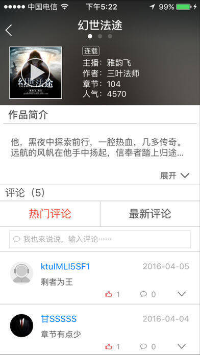 2、酷听听书不仅有当下热门电视剧原著小说,还有《三体》《三生三世十里桃花》《武动乾坤》《鬼吹灯》系列、《民调局异闻录之勉传》《十宗罪》《夜行人》《五大贼王》《福尔摩斯探案集》等高水准名家之作,震撼你的听觉。甜宠、虐心、恐怖、悬疑、玄幻、武侠等各种类型的在线离线有声小说让你听个不停,还有精彩的评书、小品、相声、脱口秀供你选择,畅享流畅的听书阅读体验。