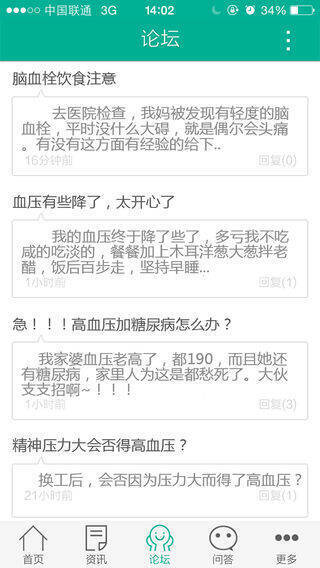 1、病友论坛:与病友探讨高血压治疗和饮食方法,相互借鉴经验。