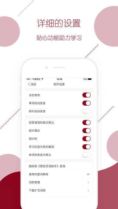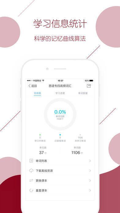1、词库丰富:有基础词汇、北外课程、DELE高频词汇等,各学习阶段、各类型的单词课本供用户自由选择;