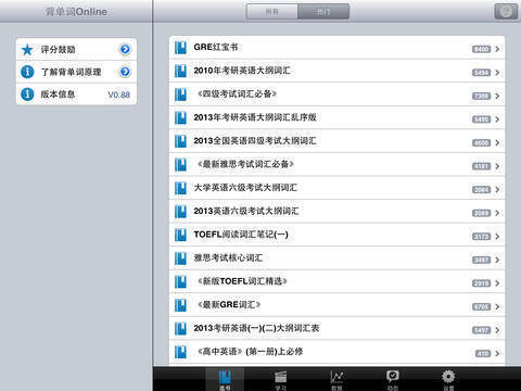软件内置了极为全面的各类英语单词书,多达500多本且持续增加中。涵盖了小学、中学、大学、四六级、考研、考博、SAT、BEC、GRE、雅思、托福等各类英语考试词汇,以及新概念、VOA等知名英语学习资料的单词,总有一本适合您。