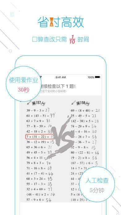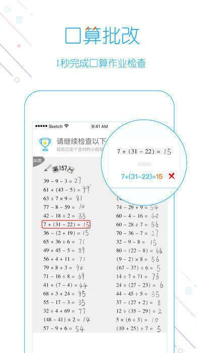 1、用户拍照上传小学口算作业,软件能在一秒内指出有问题的题目,专为小学生家长和数学老师设计,可节省 90%的时间。