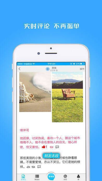 3、看帖结交新朋友:在故事贴里,大家因共同喜爱的文章相遇相知。一起品评文字,为朋友找出文章精彩段落,节省阅读时间。