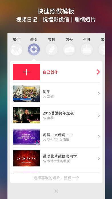【视频、照片、音乐、字幕随意搭配】可随意挑选万首歌曲,搭配文字、相片和视频,快速创意出电影作品。【一键照做】共享多个剧本,模仿大咖作品打造个人特色影片。【电影片段模板】几千款模板快速更新,满足多种场景需求。【精美视频滤镜、光影效果】专业团队精心设计,让影片更出色。【社区互动】彩友交流聚集地,优秀作品可登上热门佳作榜。【海量视频资源】大咖和彩友分享热门视频,多频道展示。【专辑分享】专属分享基地,支持多平台一次性分享。