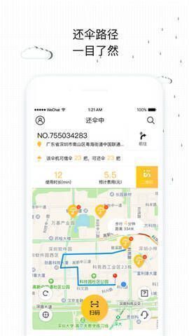 1、预约用伞:在地图上挑选即将使用的雨伞,点击预约用伞后还能选择导航。