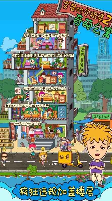这是一款超有趣、接地气且幽默搞怪的模拟经营游戏。你扮演包租婆,不断违规加盖楼层,招揽租客,建奇葩店铺,雇佣租客赚钱。