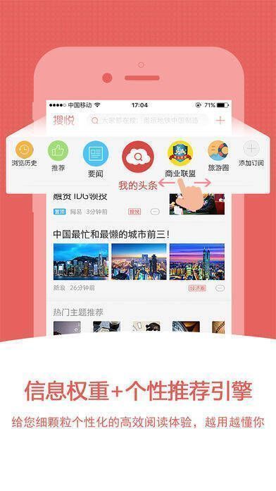 【我的头条】运用大数据算法和领先的“信息权重 + 个性化推荐引擎”,既能满足用户细致的个性化阅读需求,又能带来高效获取信息的优质阅读体验。在信息泛滥的当下,搜悦让用户拥有专属的资讯头条,只看自己订阅的最关心的内容。