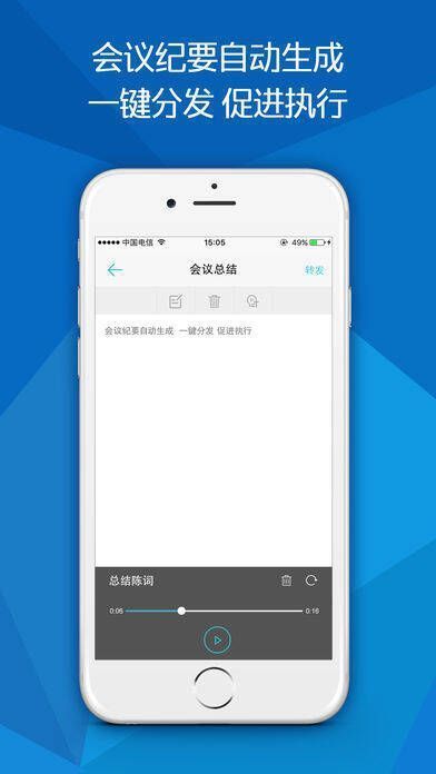 作为一款电话会议移动办公软件,会议纪要功能堪称锦上添花!主持人在开启电话会议过程中可全程录音,也能在会议总结时录音并进行STT(语音转文本)转换;您可以在会议详情页查看会议录音和会议纪要,还能手动编辑会议纪要,也可重新录音,然后一键分享,方便快捷。