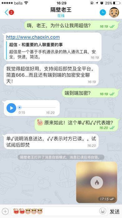 安全聊天运用端对端加密消息传输,服务器不留下任何痕迹,消息阅后即焚,真正实现绝密、无痕。