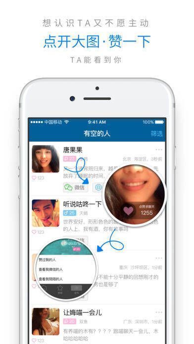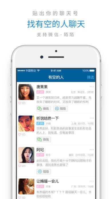 1. 可查看有空聊天的人,还能按性别、年龄、地区、星座筛选,比漂流瓶更易求易遇;