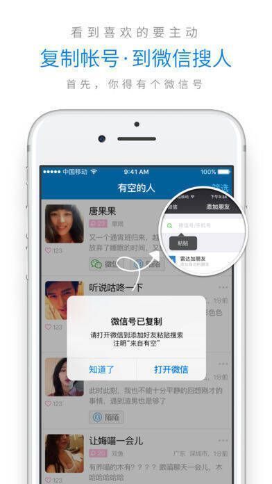 2. 能直接复制对方微信号(陌陌号),方便在聊天工具里搜索添加;