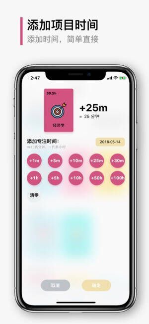在一些同类工具里,手动添加项目用时需进入项目详情页。而在须臾中,只需在项目卡片翻转后点击下方加号就能手动添加,无需设置详细起始时间,点击几下屏幕按钮即可完成。