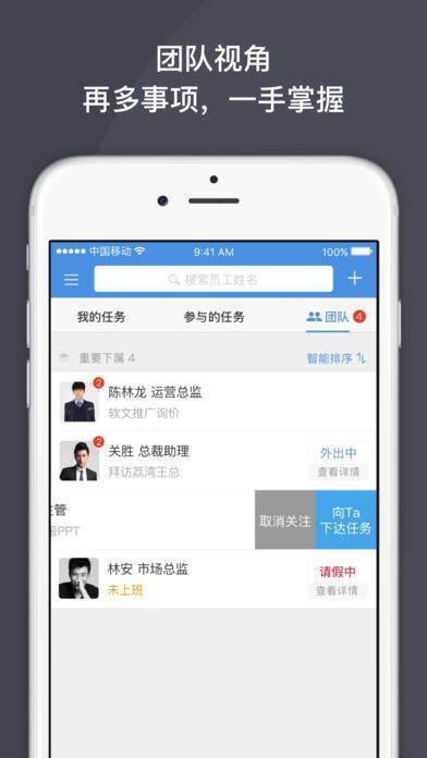 1、专为中小企业定制的移动办公SaaS服务。2、能显著提升企业管理者执行力,降低成本,挖掘优秀员工。3、可随时掌握团队任务进程,解决问题,企业通讯录查找员工便捷。4、多功能审批可随时处理,实现电子化办公。5、高效管理客户信息,提升销售效果。6、实时推送任务信息,不错过重要信息。
