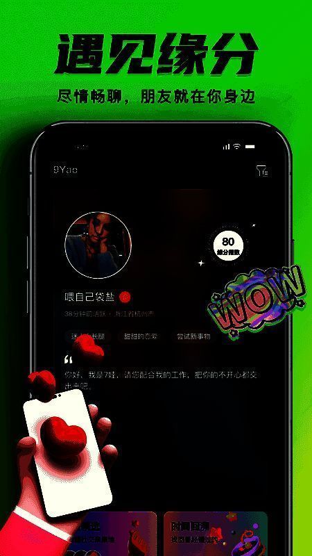 九幺短视频是一款专注于交友约会的优质软件。它采用真实主动的交友方式,让用户轻松找到心仪对象。软件特色亮点显著,有真人认证和颜值认证、每日精选高质量用户、完善的隐私保护机制等,为用户带来优质交友体验。其优势明显,能实现真实交友、轻松聊天、精准匹配,让交友过程更加愉悦。