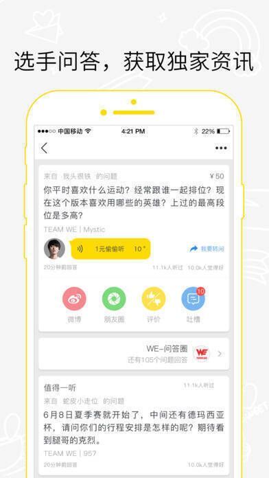 流量不足看不了视频直播?文字直播同样让你尽兴,比赛数据和赛后视频带你重温激情;亲自当俱乐部老板超带感,在伐木累幻联赛可组建梦之队,买下 Uzi、厂长、Faker 组队 PK;问答圈能直接向选手提问,实现零距离接触;有了这个 APP,电竞圈尽在掌握。