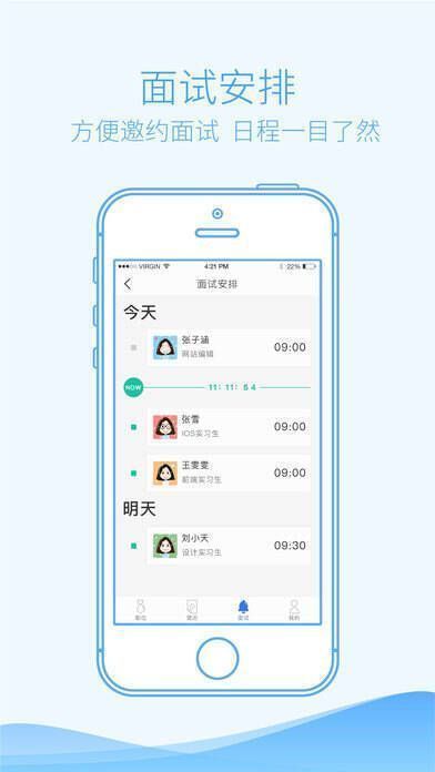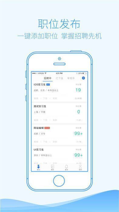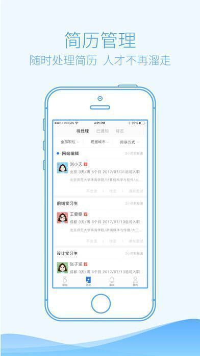 - 精准专注,可随时随地发布职位、查看简历、与候选人沟通、通知面试等。