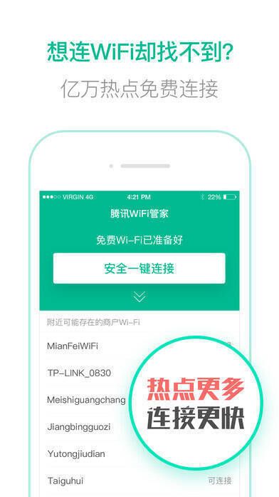 《腾讯wifi管家苹果版》是一款超实用的免费上网助手,它具备智能解析系统Wi-Fi列表的能力,用户只需点击就能快速连接。该软件能智能识别Wi-Fi列表并适配密码,真正实现一键上网。其拥有亿万免费热点,覆盖全国范围,可让用户出行时安全又快速地上网,全力为用户打造极致上网体验。