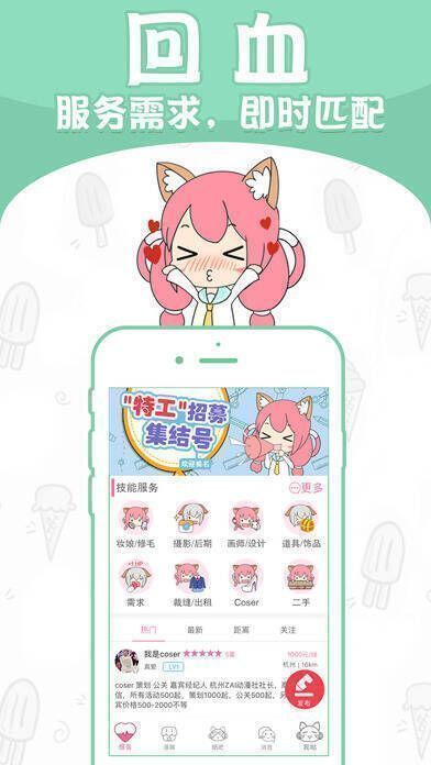 【回血服务需求】:无论是cos绘画、道具摄影,还是cv妆娘、二手租赁,你都能一键分享技能,平台会自动为你匹配,让你坐等订单,从此告别吃土烦恼。
