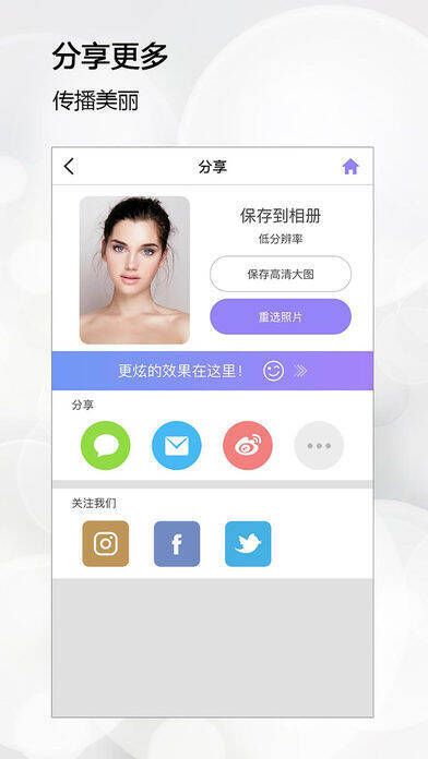 5、保存分享:可将美化照片保存到相册,通过多种社交平台分享,让朋友评分。