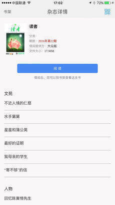 1、海量正版资源:有500种精品期刊及千种优质图书,与纸版同步更新。2、个性化设置:可调节字体大小,有护眼夜间模式。3、书签标记:多书签标记,记录精彩文章。4、多种手势:操作便捷,畅享移动阅读乐趣。