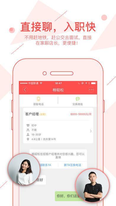 4、【轻松跳槽方式】类似微信的APP,随时随地与Boss约聊。