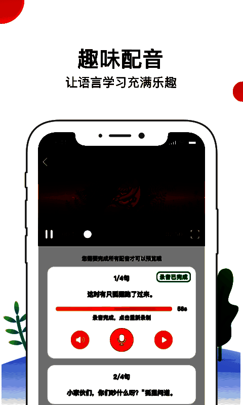 3. 有课后练习等内容,具备中英文双语配音识别与纠错功能。