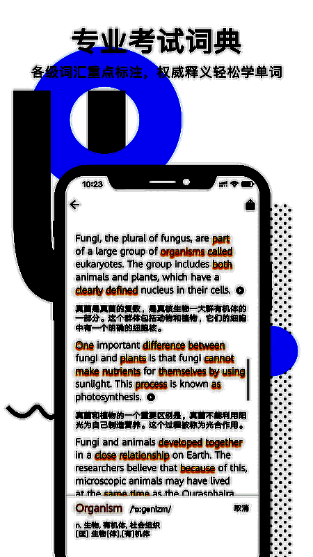 这是一款拍摄学习英语的应用,可对着书本拍照,能自由编辑拍照内容、调节照片规格大小、控制拍摄范围。它分类英语知识体系,可利用琐碎时间系统学习原版知识,还能按话题搜索喜欢的内容在线学习。有一键专业翻译、多语言全文翻译,支持全文播放,方便口语学习。