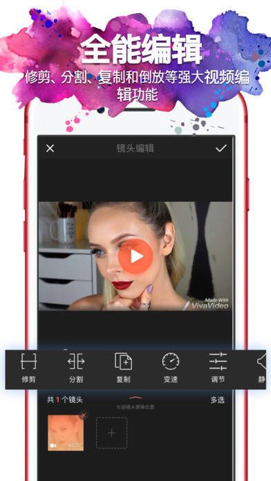 - 【神剪辑】:优化快慢镜头,能0.2s速度分段精确调整,轻松实现变声变速;拥有超酷倒放功能、模糊背景效果以及更多转场动画特效;支持逐帧剪切、镜头复制等多种剪辑操作。