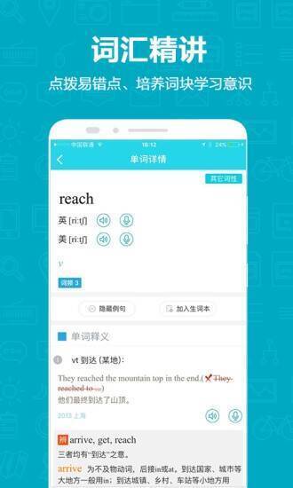 - 方便英—汉、汉—英查询与单词跳转:首次在正规学习 App 中加入汉—英查询功能,例句单词可跳转查询。