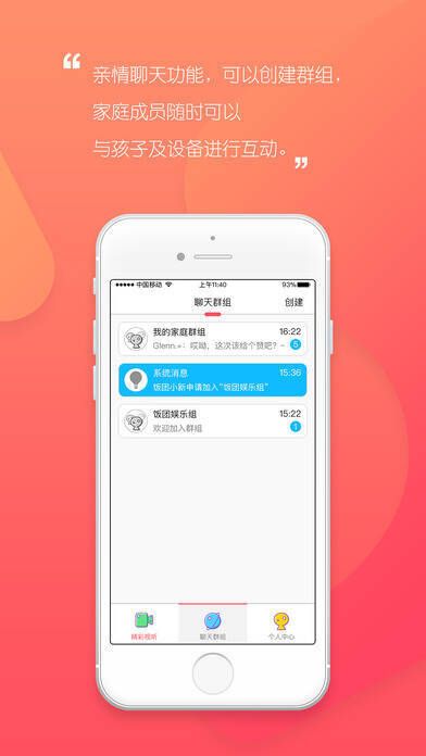 4. 亲情聊天可建群组,方便家庭成员与孩子及设备互动。