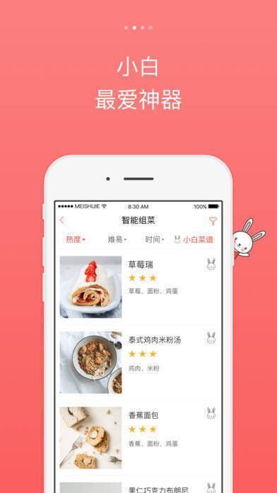 1、【小白菜谱】 增设小白菜谱按钮,让烹饪新手也能轻松上手,一学就会。