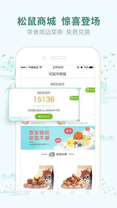 松鼠币商城:全新上线,支持币+钱兑换,新增签到功能,玩法更加丰富。