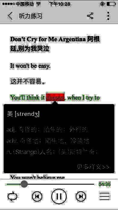 软件每天推荐丰富的英语学习听力内容,像各类英文演讲、VOA新闻、BBC新闻等。其特色包括提供海量听力资源,支持在线播放与离线下载;有24小时电台;具备简洁实用的听力播放器;支持个人主页和好友关注等。主要功能涵盖教材答案、单词宝典、在线作业等。v1.1.0版本修复了播放器可能卡住的bug。