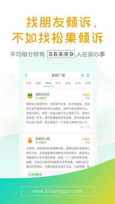 松果倾诉是情感类即时交流服务平台,无论是情感、婚姻、家庭、亲子问题,还是职场压力等话题,你都能通过即时文字或语音,在平台匿名倾诉,并获得过来人专业的开解与指导。作为国内首个情感类即时交流服务平台,它致力于助力更多处于情绪低谷的人放下包袱,继续前行,汇聚全民智慧,解决你的困扰。