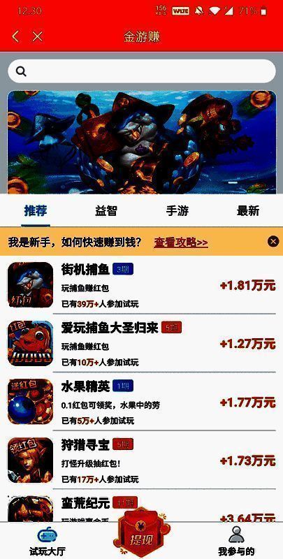 新手能获诸多奖励,快速赚钱。用户可简单试玩各类任务轻松获利,三分钟就能有丰厚回报,大量高佣金游戏等你试玩。