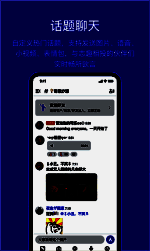 5. 话题聊天:支持即时通讯,可发送文字、图片、表情符号、视频、语音等,方便与志同道合的朋友畅快聊天。