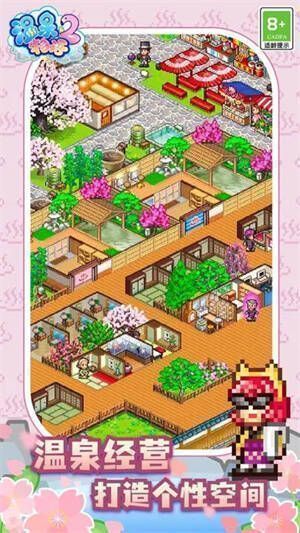 《温泉物语2苹果版》是由知名厂商Cairo Games推出的一款以温泉为主题的模拟商业游戏。它延续了Cairo Games经典的画面风格,采用卡通像素风,拥有丰富多样的游戏场景和内容,还有生动真实的角色,仿佛能将玩家带入一个充满烟火气的小镇世界。在游戏里,玩家将化身为温泉店主,自由配置食堂、小卖部、游戏室等各类设施,打造一家超有人气的酒店,感受当老板的乐趣。还能用鲜花、油画等装饰品精心装点房间。