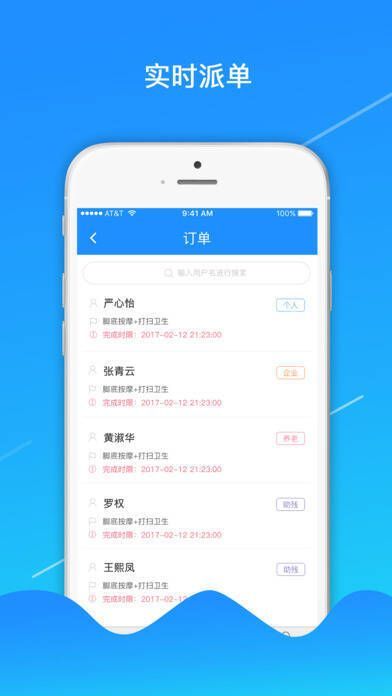 该软件面向全时云平台的所有服务人员,可让他们随时随地实时接收平台派发的订单,并轻松开展服务。操作简便,方便快捷,能让居家养老服务变得愉悦又轻松。