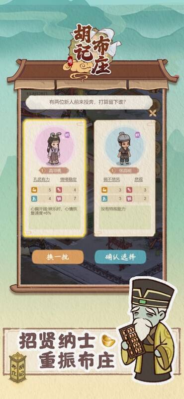 8、进入伙计界面,分为已加入和待加入两类。点击员工,可查看当前员工的等级、心情、体力、经验、体能、武力、敏捷、技艺和工作状态,还能勾选工作内容,进行遣送或赠礼。