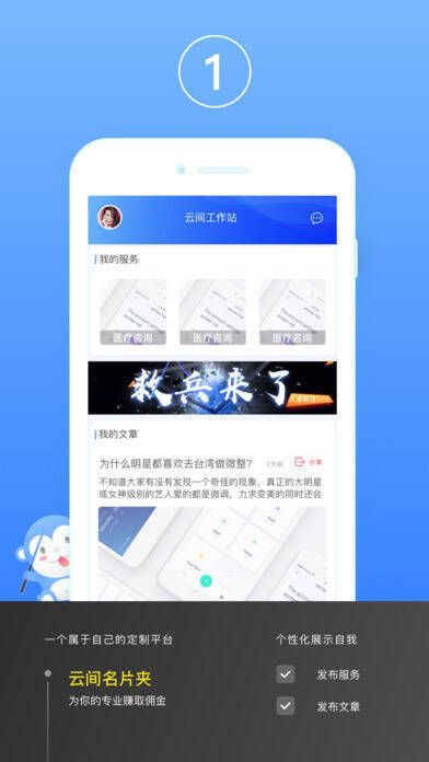 在云间工作站,每个人都有机会展示自我。你能提供自己的服务、创建文章,还能成为专业网红。我们就是强大的推手!在这里,你可创建服务、发表文章、生成专属名片,并将名片发布到任何你期望的地方。还有专业运营团队助力,把内容推送到各大社交平台,实现一键同步,推广效果可监控。