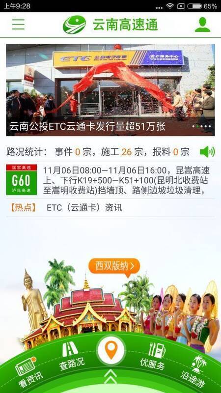 《云南高速通》APP 由云南省高速公路公司官方推出。它为全国车主提供全云南高速公路网的交通情况、信息以及路况查询服务,还能帮助车主了解附近服务区和收费等相关信息。